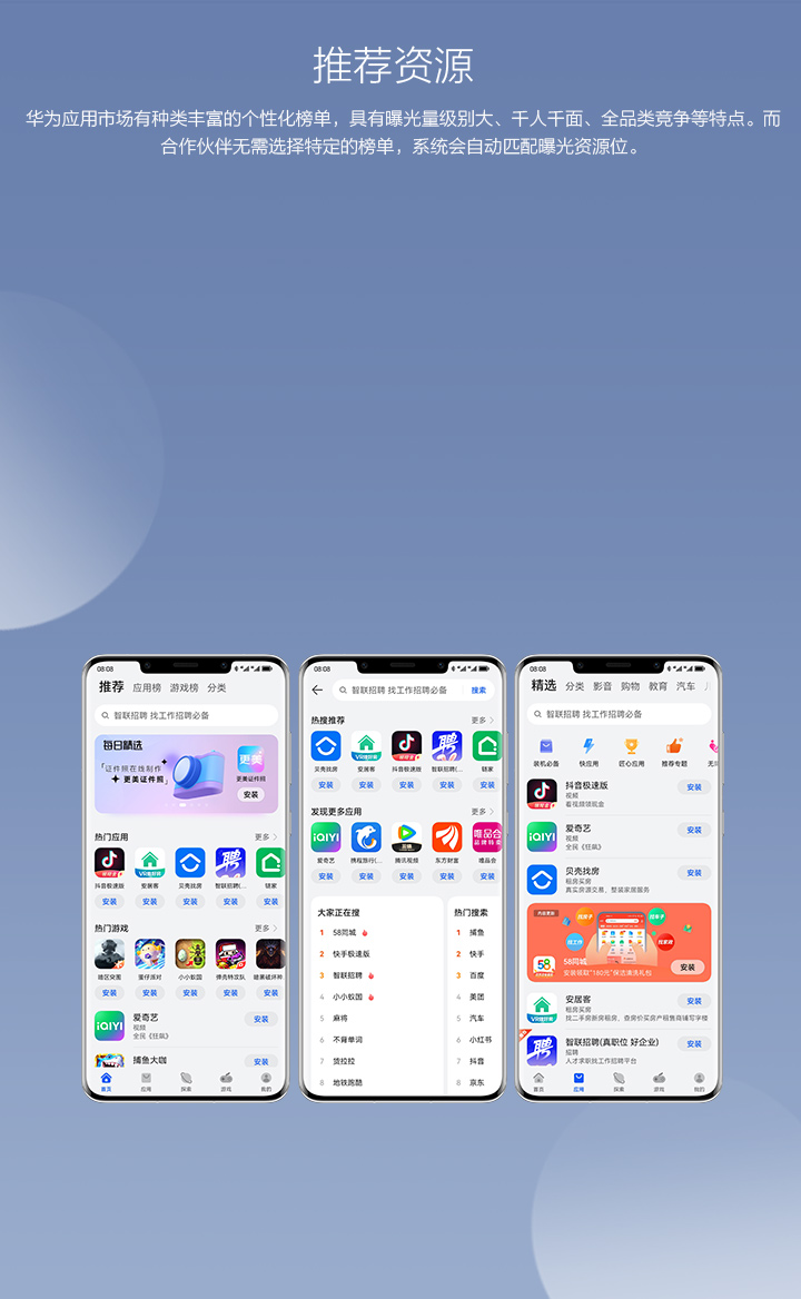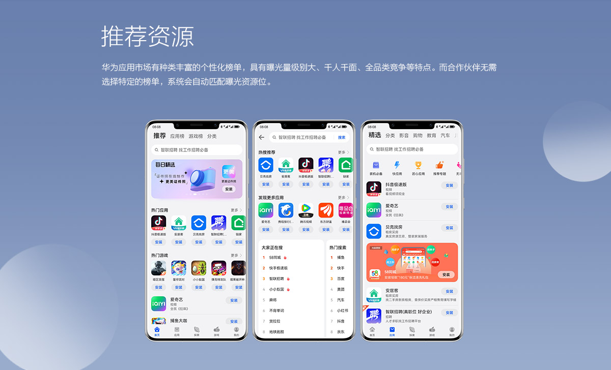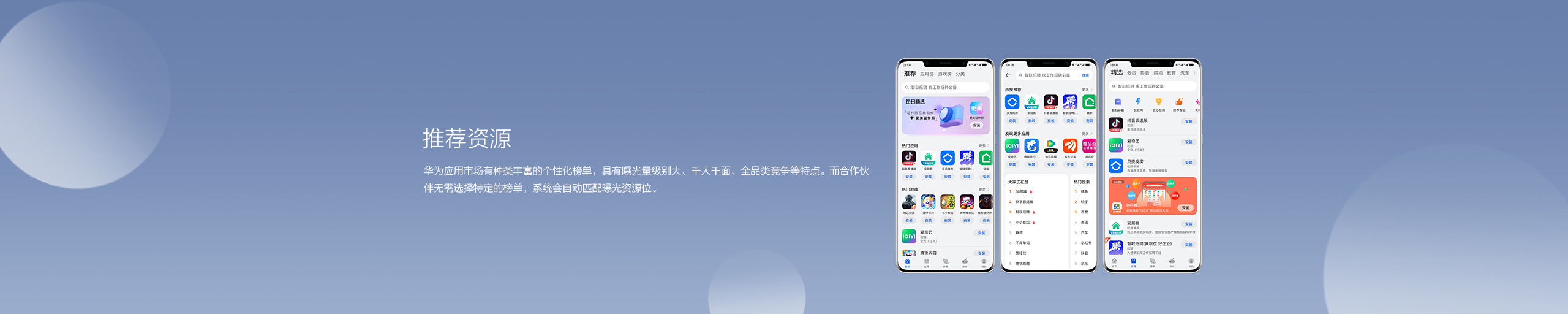 华为应用市场作为全球前三大应用分发平台之一,持续助力合作伙伴高效分发,实现用户高质量增长。华为应用市场应用推广面向合作伙伴提供精准、优质、高效的用增服务,涵盖流量资源、产品功能、赋能权益及营销方案,助力合作伙伴快速获量增长,实现商业成功。